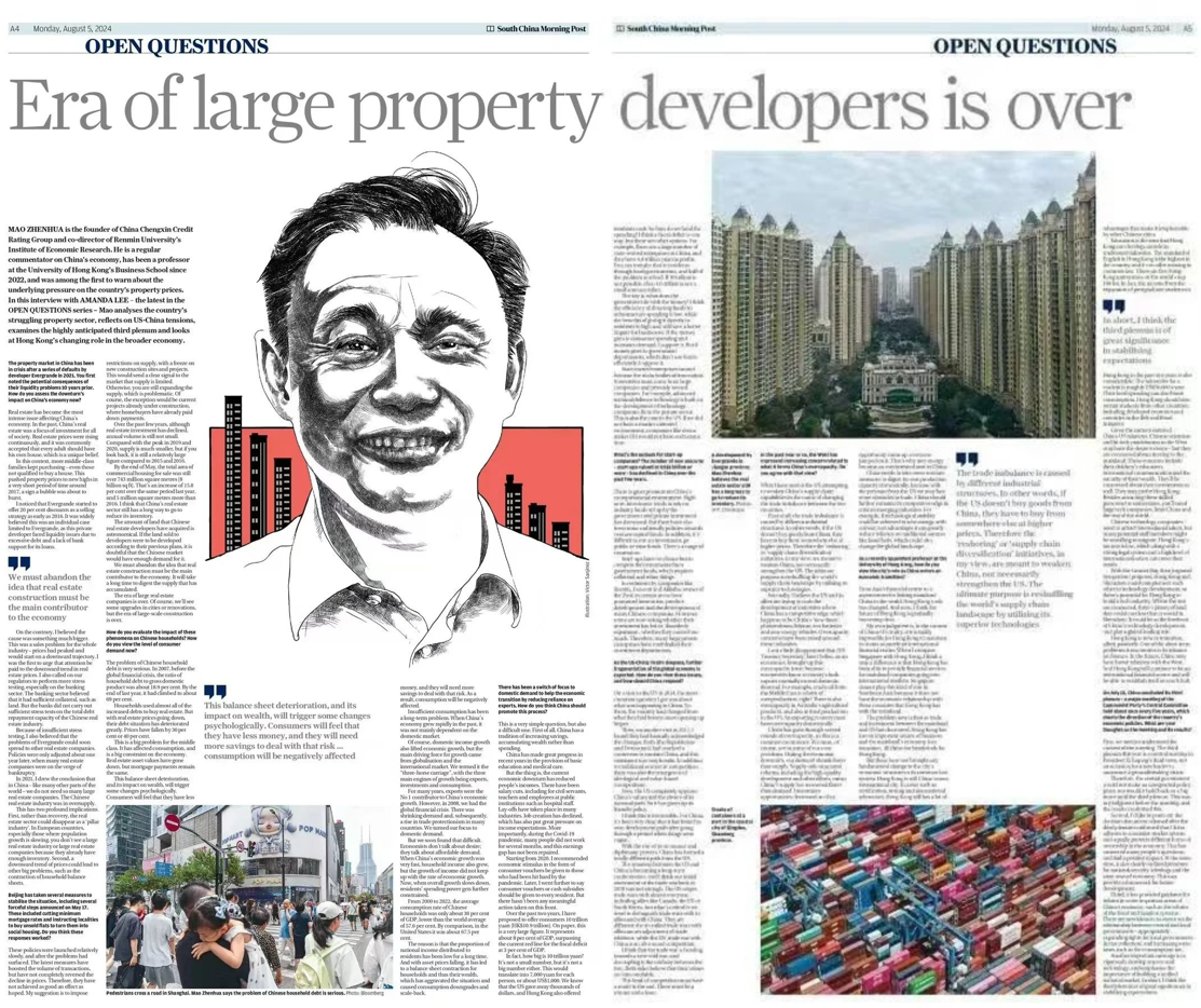 近日,香港南華早報(South China Morning Post, SCMP)在“開放問題”欄目利用兩個整版刊登了對毛振華教授的專訪,記錄了毛振華教授對當(dāng)前中國及香港經(jīng)濟的判斷和建議。南華早報始創(chuàng)于1903年,不僅是香港銷量最高的報章,也是亞洲最具公信力和影響力的媒體之一。下文為英文專訪的翻譯稿,閱讀英文原文請掃描下方二維碼閱讀。